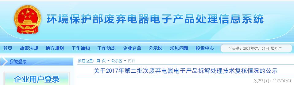 7月4日環(huán)保部環(huán)境保護(hù)部處理管理信息系統(tǒng)發(fā)布了《關(guān)于2017年第二批次廢棄電器電子產(chǎn)品拆解處理技術(shù)復(fù)核情況的公示》,具體內(nèi)容如下:關(guān)于2017年第二批次廢棄電器電子產(chǎn)品拆解處理技術(shù)復(fù)核情況的公示根據(jù)廢棄電器電子產(chǎn)品(以下簡稱廢電器)拆解處理數(shù)量審核程序的有關(guān)規(guī)定,截止2017年1月底,24個省、自治...