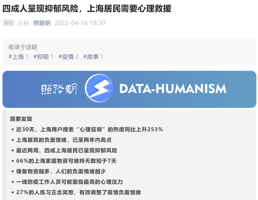 據(jù)心理領(lǐng)域的公眾號(hào)“照路明”,說現(xiàn)在上海疫情嚴(yán)重,大家隔離短的已經(jīng)半個(gè)多月,長的一個(gè)多月,近四成上海人呈現(xiàn)抑郁風(fēng)險(xiǎn),需要救援。 圖片來自網(wǎng)絡(luò) 其實(shí),這些心理救援是非常重要的。每個(gè)人碰到這種百年不遇的疫情和居家隔離,都會(huì)出現(xiàn)或多或少的心理問題。如果能打通心理咨詢熱線最好,可以聽聽專業(yè)人士的輔導(dǎo)。如果搶...