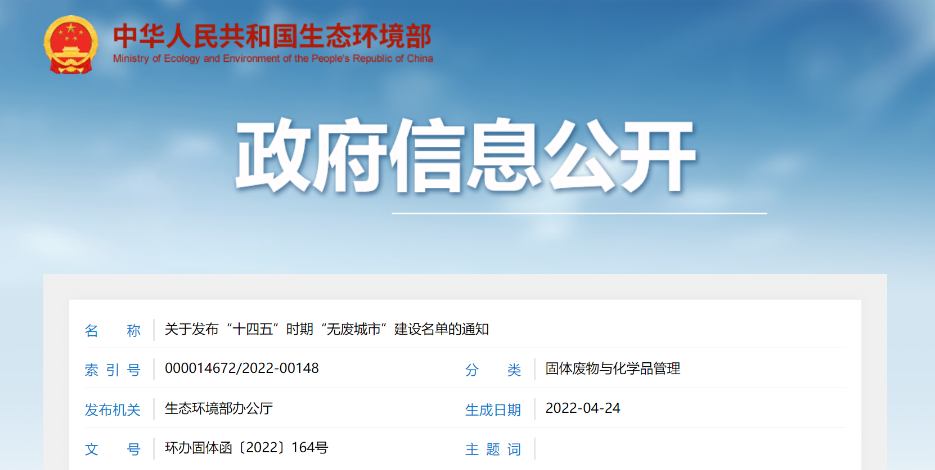 關(guān)于發(fā)布“十四五”時(shí)期“無廢城市”建設(shè)名單的通知各省、自治區(qū)、直轄市生態(tài)環(huán)境廳(局): 為落實(shí)《中共中央 國務(wù)院關(guān)于深入打好污染防治攻堅(jiān)戰(zhàn)的意見》和《“十四五”時(shí)期“無廢城市”建設(shè)工作方案》(以下簡稱《工作方案》),我部會(huì)同有關(guān)部門,根據(jù)各省份推薦情況,綜合考慮城市基礎(chǔ)條件、工作積極性和國家相關(guān)重大...