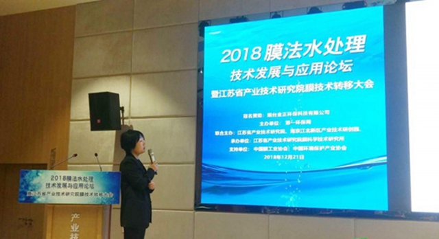 這次“2018膜法水處理技術(shù)發(fā)展與應(yīng)用論壇暨江蘇省產(chǎn)業(yè)技術(shù)研究院膜技術(shù)轉(zhuǎn)移大會”,來自金正環(huán)保的研發(fā)總監(jiān),苗晶博士對煙臺金正環(huán)保做了簡要介紹,著重介紹了金正環(huán)保在高難廢水處理領(lǐng)域所擁有的特有技術(shù)、設(shè)備、及實(shí)際案例。在上游膜材料方面,著重介紹了金正環(huán)保在膜材料方面已取得的進(jìn)展,包括低壓納濾膜、中空纖維納濾膜、雜化膜材料等。