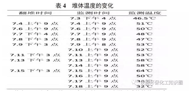 一般認為高溫菌對有機物的降解效率高于中溫菌,但溫度過高,容易導(dǎo)致嗜熱菌的死亡,從而影響處理效果,高溫堆肥最高溫度一般控制在65℃以下。堆肥過程中堆體溫度變化見表4。