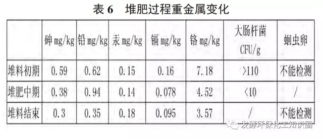表6可以看出,砷、鉛、鎘、鉻的含量都降低了,說明在堆肥過程中,大部分重金屬都得到鈍化,所以含量降低。但金屬汞的含量卻有所增加,這是因為在堆肥過程中水分和揮發(fā)性物質(zhì)損失,以及堆肥后堆體體積變小,引起該金屬在堆體中濃縮所致。