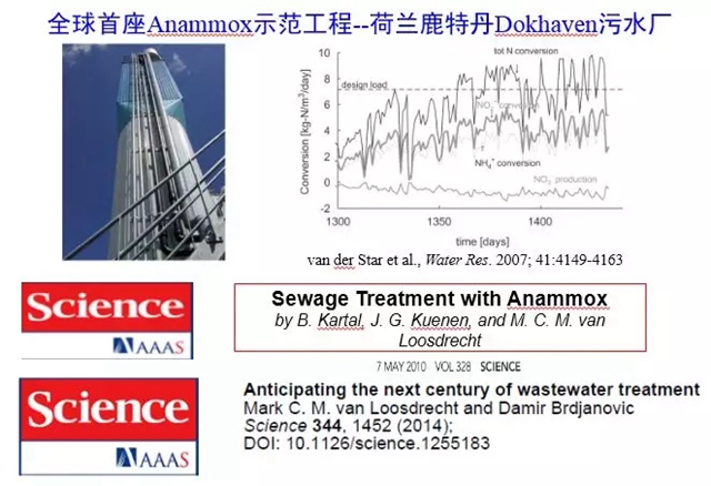 Kuenen教授的另一位主要助手Mark van Loosdrecht教授則在Anammox的實際應(yīng)用方面有很大的貢獻。他利用數(shù)學(xué)模型作為研究工具,并在公司的協(xié)助下,建立了全球第一座Anammox示范工程——荷蘭鹿特丹Dokhaven污水廠。他在2007年和2014年在《Science》上發(fā)表了關(guān)于厭氧氨氧化方面的文章。