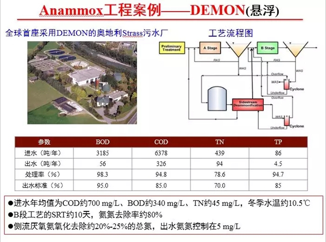 奧地利Strass污水處理廠是全球首座采用DEMON的污水廠。污泥消化液的厭氧氨氧化主要有兩個方面的核心技術(shù):一是基于pH的DO實時控制短程硝化,另一個是基于物理分離技術(shù)實現(xiàn)雙泥齡,采用旋流分離器(DEMON1.0),后改進為微篩選擇器(DEMON2.0)。Strass污水廠目前在厭氧氨氧化做的非常成功,氨氮去除率約80%,總氮去除率20%-25%,出水氨氮控制在5mg/L以下。目前這種工藝在美國、德國、瑞士等也都做的非常好。