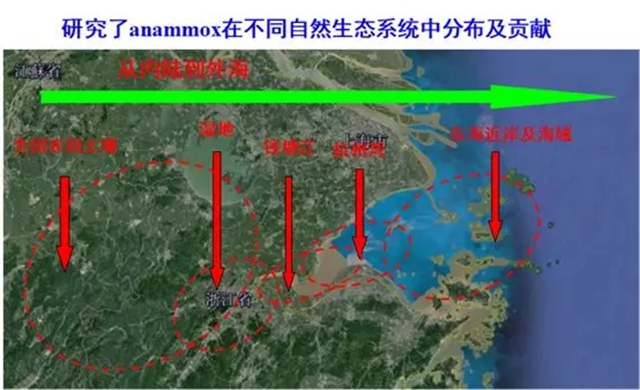 鄭平教授以前的學(xué)生--浙江大學(xué)胡寶蘭教授研究了Anammox細(xì)菌在中國不同自然生態(tài)系統(tǒng)中的分布及貢獻。她發(fā)現(xiàn),Anammox細(xì)菌廣泛存在于不同的自然生境中,且沉積物的有機碳和無機氮是影響Anammox分布的主要因素。她還發(fā)現(xiàn)人類活動影響了Anammox菌的分布,甚至特定Anammox菌可作為人類活動的指示菌。