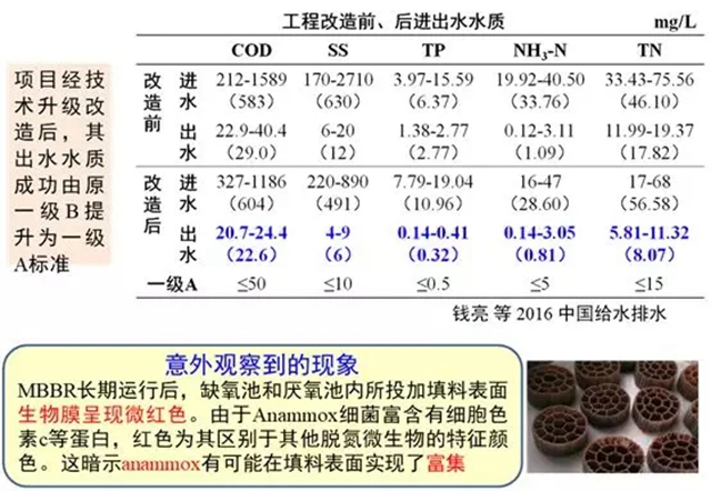 該廠的MBBR在長期運行后,缺氧池和厭氧池內(nèi)所投加填料表面生物膜呈現(xiàn)微紅色。由于Anammox細(xì)菌富含細(xì)胞色素c等蛋白,紅色為其區(qū)別于其他脫氮微生物的特征顏色。這暗示Anammox有可能在填料表面實現(xiàn)了富集。