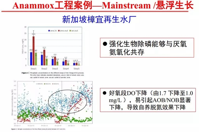除了污泥消化液、工業(yè)廢水,近五年全球擴大了對Anammox在城市污水主流程中的應(yīng)用。新加坡樟宜再生水廠是新加坡最大的再生水廠,也是國際上首個強化生物除磷與厭氧氨氧化在大型污水廠共存的案例。短污泥齡和適宜溶解氧是實現(xiàn)懸浮游離厭氧氨氧化菌生長的必要條件,在好氧區(qū)實現(xiàn)部分硝化和亞硝酸鹽積累,缺氧區(qū)進行厭氧氨氧化反應(yīng)(脫氮貢獻率30%),整體工藝能耗降低10%-30%,池容減少10%-40%。新加坡公用事業(yè)局的科學(xué)家曹業(yè)始博士在該污水廠Anammox技術(shù)的設(shè)計和應(yīng)用中發(fā)揮了重要作用。