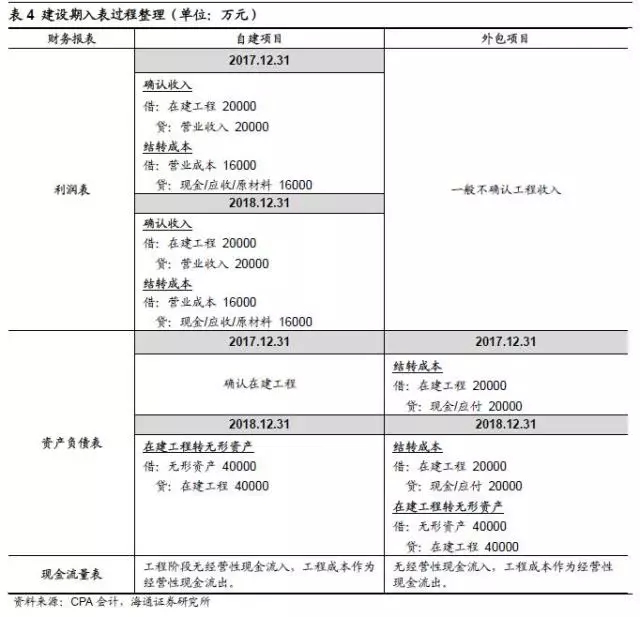 若該項目為項目公司自建,則建設(shè)期項目公司將根據(jù)完工進(jìn)度確認(rèn)工程收入并計入在建工程,項目完工后在建工程轉(zhuǎn)為無形資產(chǎn),工程階段雖有工程收入并確認(rèn)利潤,但并無實際經(jīng)營性現(xiàn)金流入。若項目公司將項目發(fā)包,通常不確認(rèn)工程收入,即建造期不影響利潤表,根據(jù)完工進(jìn)度向承包方支付工程款,確認(rèn)在建工程,項目完工后將在建工程結(jié)轉(zhuǎn)為無形資產(chǎn)。項目運(yùn)營階段,公司確認(rèn)項目運(yùn)營收入(主要是垃圾處理費(fèi)和上網(wǎng)發(fā)電收入),結(jié)轉(zhuǎn)相關(guān)成本,成本項包含無形資產(chǎn)的攤銷。項目建設(shè)期和運(yùn)營期的主要會計科目錄入如表4和表5: