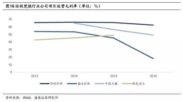偉明環(huán)保項目運(yùn)營毛利率較高,2015年為65.9%,2016年小幅下降,為62.5%;中國天楹運(yùn)營業(yè)務(wù)毛利率也相對較高,2016年為49.2%,但相較于2014年的65.1%下滑近16個百分點;綠色動力2015年毛利率為49.0%;盛運(yùn)環(huán)保2015年運(yùn)營業(yè)務(wù)毛利率為45.3%,2016年為18.0%。