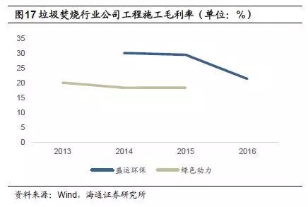 盛運(yùn)環(huán)保和綠色動力兩家公司確認(rèn)工程業(yè)務(wù)收入。工程業(yè)務(wù)毛利率方面,盛運(yùn)環(huán)保相對較高,2015年為29.4%,2016年下降至21.3%;綠色動力雖確認(rèn)工程業(yè)務(wù)收入,但項目主要系外包給其他方,建造收入根據(jù)獨(dú)立評估師評定的公允價值計量,毛利率較低,2015年為18.3%。