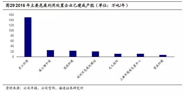 東江環(huán)保龍頭地位顯著。截止2016年底,東江環(huán)保已擁有國家危險廢物名錄中46大類中的44類危廢經(jīng)營資質(zhì),僅次于威立雅中國,公司危廢利用和處置資質(zhì)近150萬噸/年(其中無害化處置資質(zhì)達(dá)到72萬噸/年),遠(yuǎn)遠(yuǎn)高于威立雅中國,另根據(jù)公司規(guī)劃,預(yù)計到2020年總產(chǎn)能將達(dá)到350萬噸(其中無害化產(chǎn)能達(dá)到200萬噸),增長空間可觀。