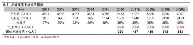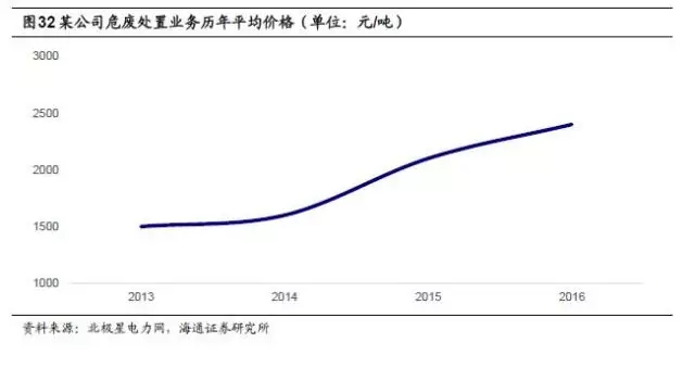 危廢處置價格穩(wěn)步上升,市場空間巨大。從核準(zhǔn)經(jīng)營規(guī)??矗U處置產(chǎn)能緊缺,2015年核準(zhǔn)處置規(guī)模僅982.4萬噸/年。近年來,危廢處置價格呈現(xiàn)穩(wěn)步上升趨勢。以行業(yè)內(nèi)某領(lǐng)先企業(yè)為例,2013年,其危廢處置業(yè)務(wù)平均價格為1500元/噸左右,2016年則上升至2500元/噸左右。以全國環(huán)境統(tǒng)計公報數(shù)據(jù)為基礎(chǔ),假設(shè)未來幾年危廢產(chǎn)生量保持過去十年復(fù)合增長率12%的增速,保守估計處置率為35%,單位處置成本為2500元/噸,則預(yù)計2020年危廢處置市場為613億元,2017-2020處置市場空間總計2086億元??紤]到還有大量的危廢沒有進(jìn)入國家統(tǒng)計口徑,若將這些量考慮在內(nèi),市場空間還將提升2-3倍。