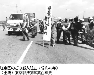 另一方面,江東區(qū)政府和區(qū)民也慢慢意識到,都政府關(guān)于垃圾填埋到1970年為止的承諾,根本沒有實現(xiàn)的可能性。到了1971年,平均每天有5000輛以上的搬運車,將東京中心23區(qū)所生產(chǎn)的垃圾中的70%搬運到江東區(qū)進行填埋。由此產(chǎn)生的交通堵塞、蚊蟲叢生、空氣污染甚至是火災(zāi),給江東區(qū)區(qū)民的日常生活造成重大困擾。