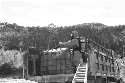 圖為當(dāng)?shù)丨h(huán)保局工作人員在賀州非法傾倒危險廢物案現(xiàn)場采樣。