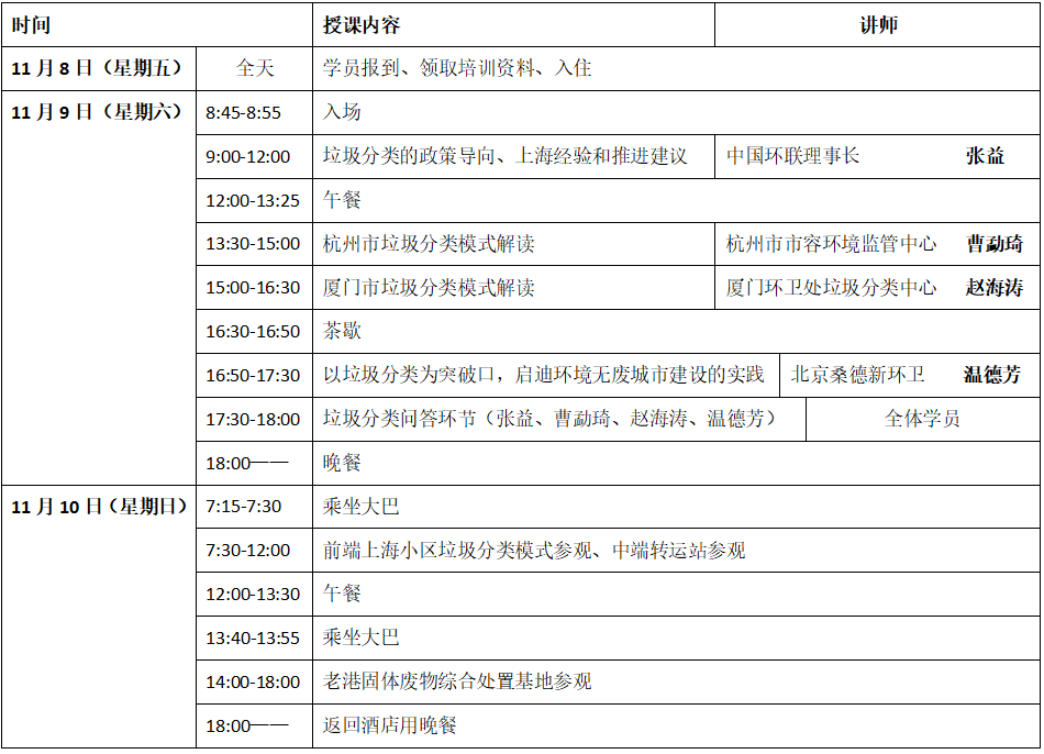 (一)培訓(xùn)班將邀請垃圾分類主管部門相關(guān)負(fù)責(zé)人和行業(yè)知名專家授課,培訓(xùn)班結(jié)束后頒發(fā)中國戰(zhàn)略性新興產(chǎn)業(yè)環(huán)保聯(lián)盟垃圾分類培訓(xùn)結(jié)業(yè)證書。