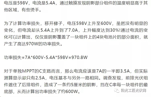 經(jīng)過(guò)勘探與計(jì)算得出該電站的功率因?yàn)閮商庩幱皩?dǎo)致?lián)p失高達(dá)1570W。除了功率損失之外,光伏系統(tǒng)中的陰影造成熱斑,長(zhǎng)期如此,會(huì)加速組件老化,嚴(yán)重影響組件壽命。