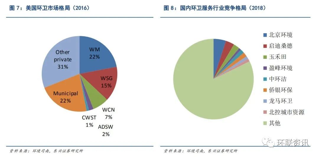 而國內環(huán)衛(wèi)服務公司以清掃為主,從事收集轉運、也必須以清掃為入口才能切入,從而導致中國的環(huán)衛(wèi)市場較為分散。從商業(yè)模式來看,表現(xiàn)為美國的環(huán)衛(wèi)服務企業(yè)更為資本密集型,而國內的環(huán)衛(wèi)服務企業(yè)為勞動密集型企業(yè)。