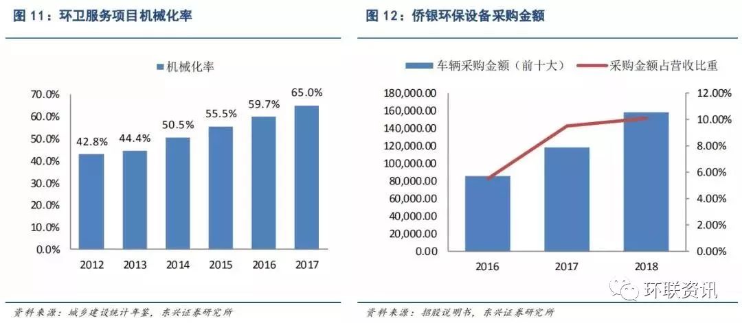 環(huán)衛(wèi)機械化率提升。近幾年我國市政環(huán)衛(wèi)機械化進程較快,上市公司的機械設備采購金額占比明顯提升,據(jù)披露,玉禾田機械設備采購金額 2017 年和 2018 年的增幅分別達到 108.86%、54.99%,分別占營業(yè)收入12.18%、14.42%;僑銀環(huán)保 2017 年和 2018 年的增幅分別達到 137.73%、40.47%,分別占營業(yè)收入 9.51%、10.06%。此外,國務院住建部城鄉(xiāng)建設統(tǒng)計公報顯示,機械化清掃率從 2012 年的 42.8%提升到 2017 年的65.0%。由于目前機械化數(shù)據(jù)統(tǒng)計標準較為寬松,較多機械化清掃后的面積仍需通過人工再清理,雖然數(shù)據(jù)提升較快,但我國目前的機械化程度仍處于較低水平。
