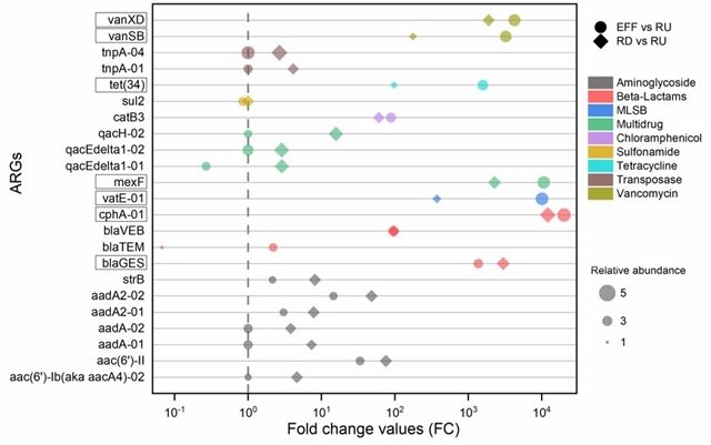 先前的研究表明,垃圾滲濾液中含有大量ARGs,而含有ARGs的出水的排放將導(dǎo)致ARGs不斷進(jìn)入環(huán)境。然而,關(guān)于垃圾滲濾液處理廠處理后出水對(duì)接收河流中的ARG豐度和組成影響的研究還很少,同時(shí),出水排放引入的ARGs的種類(lèi)以及富集情況仍不清楚。