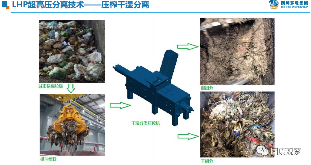 該項目設計規(guī)模是餐飲垃圾日處理400噸,廚余垃圾日處理600噸,糞污日處理1000噸,病死畜禽日處理40噸,合計設計規(guī)模2040噸,在近一年的實際運營期間,隨著廣州市垃圾分類和疫情的情況,產能結構發(fā)生變化。主要特點是:1、垃圾分類不斷推進,廚余垃圾實際處理量增大;2、廣州舊城改造推進,糞污實際清運和處理量比設計小;在實際運營中,其中餐飲垃圾目前處理量約500-600噸/天;廚余垃圾平均處理量約為1000噸/天,最高峰可達到近1200噸/日,占總處理量的一半以上。1. 朗坤環(huán)境集團一直踐行如果對廚余垃圾去干榨凈,如何減少篩余物的含水率,提升篩余物的熱值?如何減少有機質的流失?如何提升廚余垃圾的減量率?如何減少篩余物的外運量?如何更好實現物質的能源轉化?朗坤環(huán)境集團研發(fā)的LHP超高壓分離技術真正對廚余垃圾做到了去干榨凈,通過在廣州項目一年多的應用實踐,出渣易腐有機物比例達到了8-18%,預處理階段廚余垃圾整體減量達到了75-85%,僅有15-25%的篩余物外運焚燒,實現了較高的減量率和有機質提取率,工藝運行穩(wěn)定、可靠,可以處理不破袋的廚余垃圾。