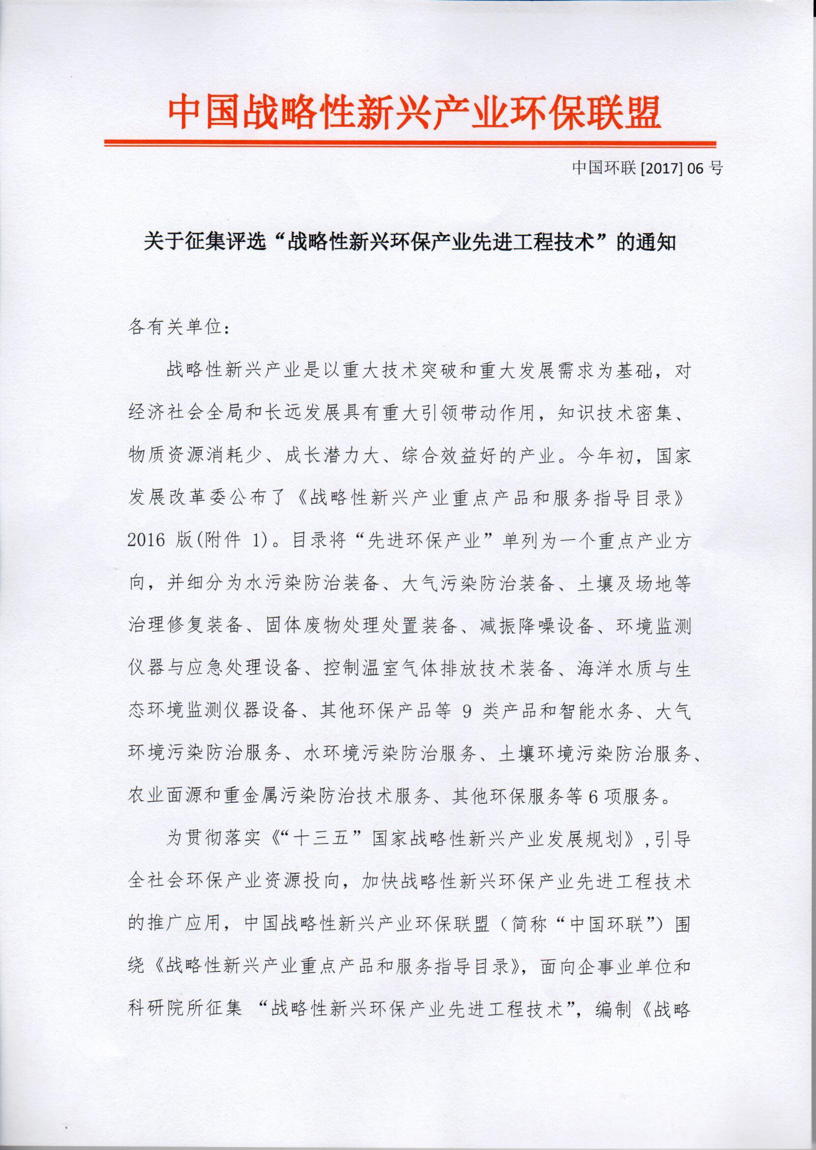 為貫徹落實(shí)《“十三五”國(guó)家戰(zhàn)略性新興產(chǎn)業(yè)發(fā)展規(guī)劃》,引導(dǎo)全社會(huì)環(huán)保產(chǎn)業(yè)資源投向,加快戰(zhàn)略性新興環(huán)保產(chǎn)業(yè)先進(jìn)工程技術(shù)的推廣應(yīng)用,中國(guó)戰(zhàn)略性新興產(chǎn)業(yè)環(huán)保聯(lián)盟(簡(jiǎn)稱(chēng)“中國(guó)環(huán)聯(lián)”)圍繞《戰(zhàn)略性新興產(chǎn)業(yè)重點(diǎn)產(chǎn)品和服務(wù)指導(dǎo)目錄》,面向企事業(yè)單位和科研院所征集“戰(zhàn)略性新興環(huán)保產(chǎn)業(yè)先進(jìn)工程技術(shù)”,編制《戰(zhàn)略性新興環(huán)保產(chǎn)業(yè)先進(jìn)工程技術(shù)名錄》。