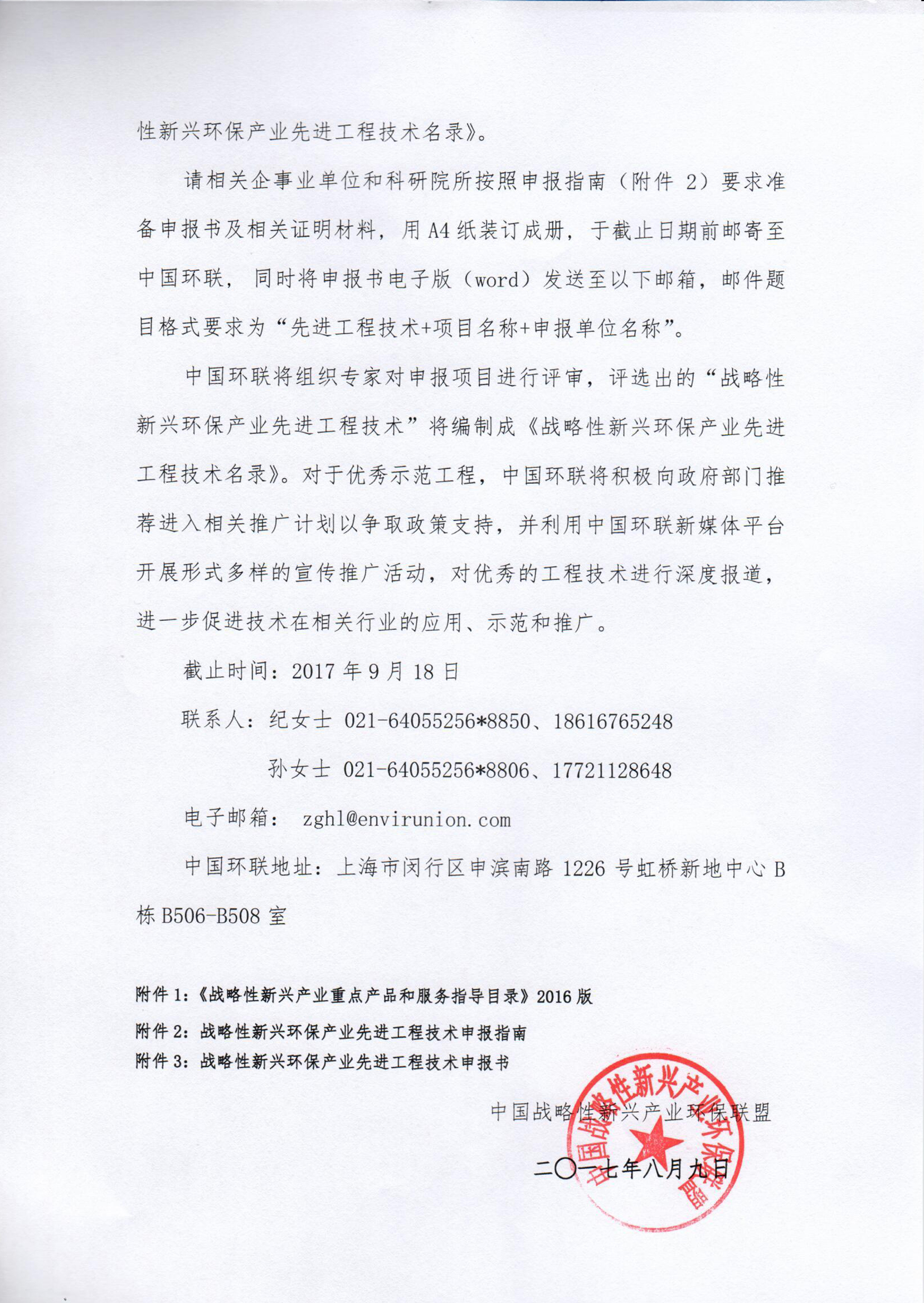 請(qǐng)相關(guān)企事業(yè)單位和科研院所按照申報(bào)指南(附件2)要求準(zhǔn)備申報(bào)書(shū)及相關(guān)證明材料, 用A4紙裝訂成冊(cè), 于截止日期前郵寄至中國(guó)環(huán)聯(lián), 同時(shí)將申報(bào)書(shū)電子版(word)發(fā)送至以下郵箱,郵件題目格式要求為“先進(jìn)工程技術(shù)+項(xiàng)目名稱(chēng)+申報(bào)單位名稱(chēng)”。