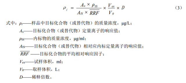 當目標化合物(或替代物)采用平均相對響應因子進行校準時,樣品中目標化合物(或替代物)的質量濃度(μg/L),按照公式(3)進行計算: