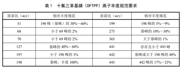 每次分析前,應進行質譜自動調諧,再將氣相色譜和質譜儀設定至分析方法要求的儀器條件,并處于待機狀態(tài),通過氣相色譜進樣直接注入 1.0 µl 十氟三苯基膦使用液(4.15),對整個系統(tǒng)進行檢查,每運行 12 h 檢查一次,得到十氟三苯基膦質譜圖,其質量碎片的離子的豐度應全部符合表 1 中的要求。否則須清洗質譜儀離子源。