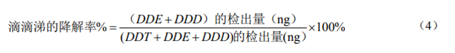 用色譜進樣口檢查液(4.8)來檢查氣相色譜儀注射入口的惰性,滴滴涕(DDT)到滴滴伊(DDE)和滴滴滴(DDD)的降解率不應超過 15%,滴滴涕的降解率按公式(4)進行計算。如果 DDT 衰減過多或出現(xiàn)較差的色譜峰,則需要清洗或更換進樣口,同時還應截取毛細管柱前段約5 cm。聯(lián)苯胺和五氯苯酚等極性化合物在進樣口易出現(xiàn)分解,峰形出現(xiàn)拖尾分裂等現(xiàn)象,也應進行同樣的處理。