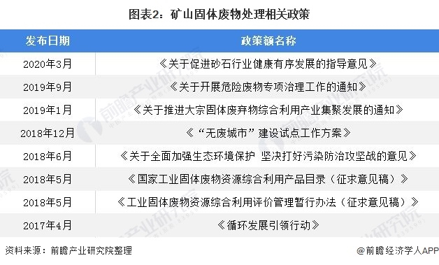 為了消除礦山固體廢物導致的污染,政府現(xiàn)積極推動綜合利用礦山固體廢物。固廢處理行業(yè)作為保護生態(tài)平衡、實現(xiàn)可循環(huán)經(jīng)濟的重要推動力量,與之相關的國家政策頻頻發(fā)布。
