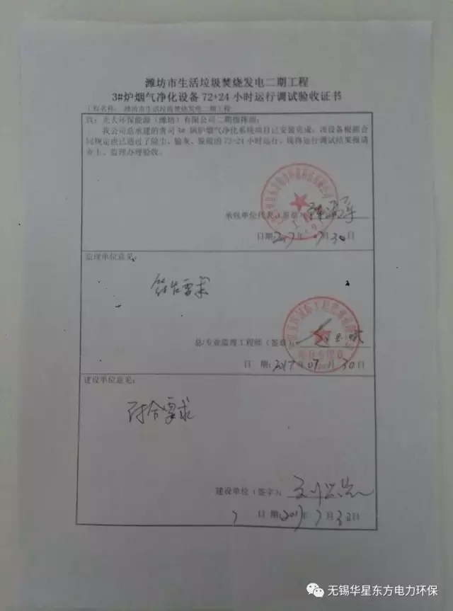 2017年7月30日,我公司承建的山東濰坊3x500t/d生活垃圾焚燒廠二期工程通過72+24小時試運(yùn)行。