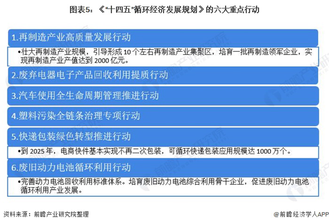 《規(guī)劃》還提出了重點工程與行動,共有五大重點工程和六大重點行動。五大重點工程分別為城市廢舊物資循環(huán)利用體系建設(shè)工程、園區(qū)循環(huán)化發(fā)展工程、大宗固廢綜合利用示范工程、建筑垃圾資源化利用示范工程和循環(huán)經(jīng)濟關(guān)鍵技術(shù)與裝備創(chuàng)新工程。