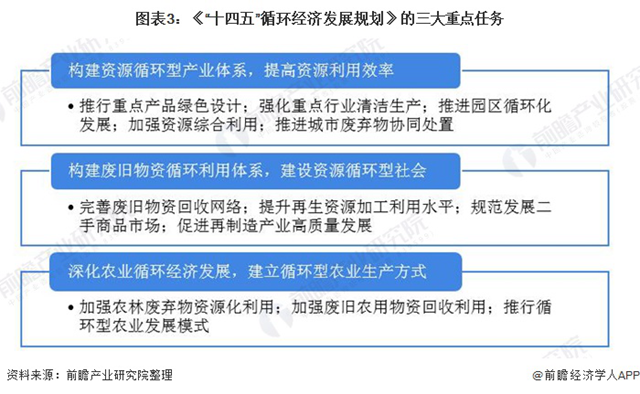 《規(guī)劃》提出了三大重點任務(wù)包括:構(gòu)建資源循環(huán)型產(chǎn)業(yè)體系,提高資源利用效率;構(gòu)建廢舊物資循環(huán)利用體系,建設(shè)資源循環(huán)型社會;深化農(nóng)業(yè)循環(huán)經(jīng)濟發(fā)展,建立循環(huán)型農(nóng)業(yè)生產(chǎn)方式。