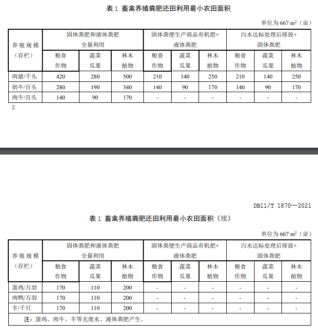 7.2 不同畜種及一定規(guī)模養(yǎng)殖場戶所需的糞肥還田利用最小農(nóng)田面積按照表 1 的規(guī)定執(zhí)行。