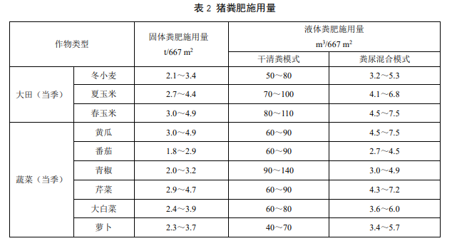8.3 當(dāng)以施用畜禽養(yǎng)殖糞肥作為作物養(yǎng)分唯一來源時(shí),中等土壤肥力農(nóng)田的豬糞肥施用量按照表 2 的規(guī)定執(zhí)行。當(dāng)有條件進(jìn)行土壤肥力測試時(shí),施用量可按照不同土壤肥力水平進(jìn)行適當(dāng)調(diào)整。