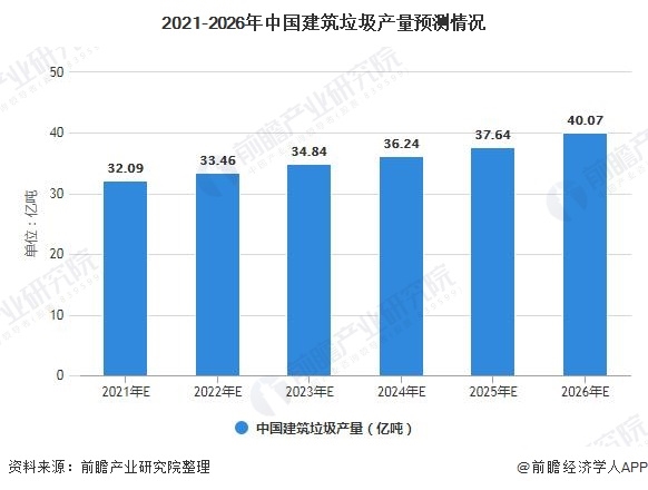 前瞻根據(jù)初步預(yù)測(cè)到2021年我國需要處理的建筑垃圾產(chǎn)量將達(dá)到32.09億噸,2026年,產(chǎn)量有望突破40億噸;若以35元/噸(運(yùn)輸費(fèi)與處置費(fèi))計(jì)算,預(yù)計(jì)2021年建筑垃圾處理市場(chǎng)規(guī)模將超過1400億元。