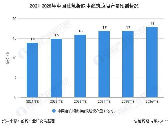 根據(jù)2020公布的《政府工作報(bào)告》中,明確提出2020年作為棚改拆遷的“收尾之年”,意味著大規(guī)模棚改拆遷時(shí)代將逐漸退場(chǎng)。隨著“十三五”期間,大規(guī)模的歷史遺留危舊住房及簡(jiǎn)易棚戶屋在此期間被拆除,現(xiàn)有存量住房平均質(zhì)量得到明顯提升的背景下,前瞻保守預(yù)計(jì)我國建筑拆除面積2021-2026年將保持在5%低速增長(zhǎng),前瞻初步測(cè)算到2026年我國建筑拆除中建筑垃圾的產(chǎn)量將達(dá)到18億噸以上。