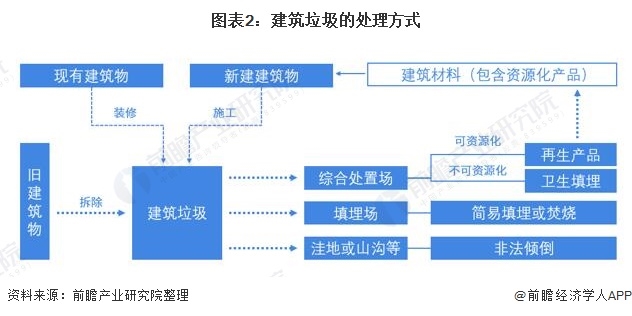 目前我國建筑垃圾處理主要分為兩種方式,一種是建筑垃圾運(yùn)往當(dāng)?shù)亟ㄖ{場(chǎng),再進(jìn)行資源化、填埋或者焚燒處理;第二種是由建筑垃圾資源化企業(yè)向工程承包商對(duì)建筑垃圾進(jìn)行采購,運(yùn)往相關(guān)回收企業(yè)進(jìn)行資源化生產(chǎn)。
