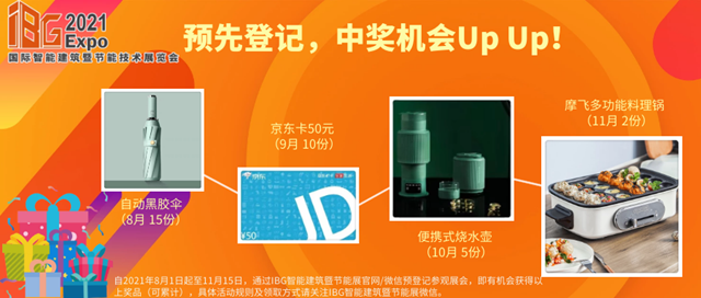 據悉,“IBG國際智能建筑暨節(jié)能技術展覽會”觀眾預登記已開啟,自8月開始至11月預登記的觀眾有機會享自動黑膠傘、京東卡、便攜式燒水壺、摩飛多功能料理鍋等實用好禮!活動獎品可累計,越早登記中獎機會越多。主辦方期待于2021年11月30日-12月2日與更多業(yè)內人士相聚上海新國際博覽中心,共筑智能建筑生態(tài)圈!