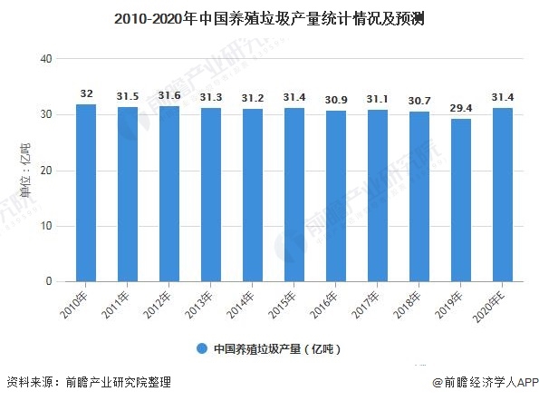 快速發(fā)展的畜牧業(yè),在保證了不斷增長的畜產(chǎn)品需求的同時(shí),也產(chǎn)生了大量的養(yǎng)殖廢棄物。不同禽畜產(chǎn)生的糞便量不同,前瞻根據(jù)禽畜養(yǎng)殖規(guī)模,結(jié)合禽畜飼養(yǎng)周期以及飼養(yǎng)量對全國養(yǎng)殖垃圾產(chǎn)量進(jìn)行估計(jì),2020年全國養(yǎng)殖垃圾產(chǎn)量約為31.4億噸,給環(huán)境治理帶來了巨大的壓力。