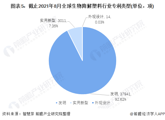 在專利類型方面,目前全球有37941項生物降解塑料專利為發(fā)明專利,占全球生物降解塑料專利申請數(shù)量最多,為92.62%。實用新型生物降解塑料專利和外觀設計型生物降解塑料專利數(shù)量分別為3011和14,分別占全球生物降解塑料專利申請數(shù)量的7.35%和0.03%。