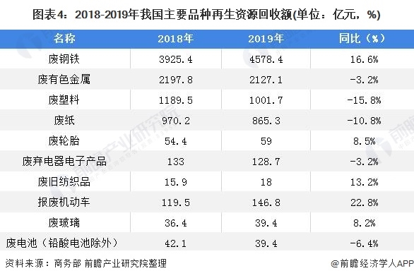 2019年報廢機動車、廢鋼鐵、廢舊紡織品、廢輪胎、廢玻璃等品種的回收額均有所增長,其中報廢機動車回收額增幅較高,同比增長22.8%。
