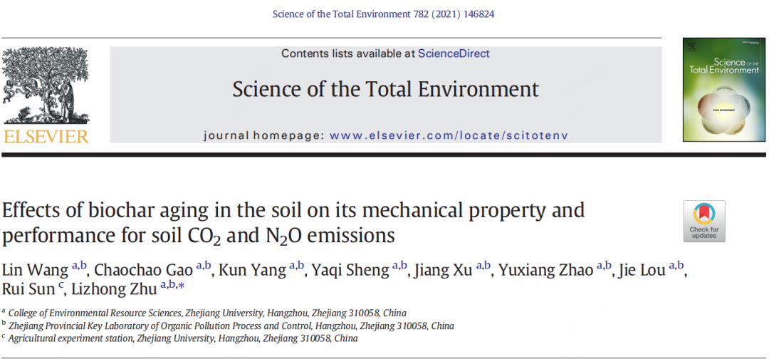 Wang, L., Gao, CC., Yang, K., Sheng, YQ., Xu, J., Zhao, YX., Lou, J., Sun, R., Zhu, LZ., 2021. Effects of biochar aging in the soil on its mechanical property and performance for soil CO2 and N2O emissions, Sci Total Environ 782, 146824.