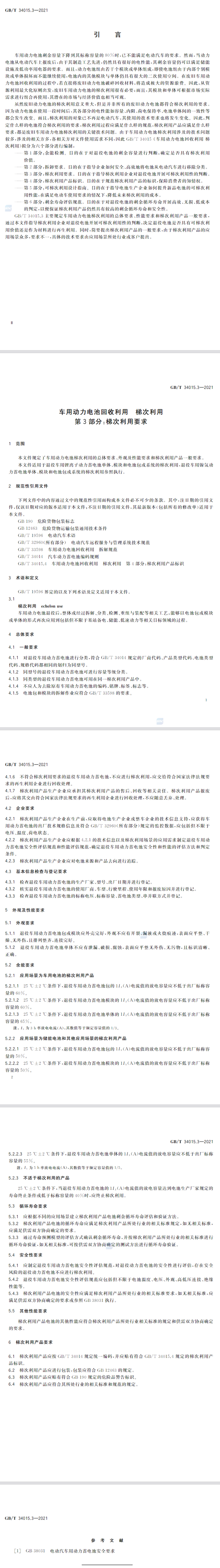 本文件是GB/T 34015“車(chē)用動(dòng)力電池回收利用、梯次利用”的第3部分。GB/T 34015已經(jīng)發(fā)布了以下部分: