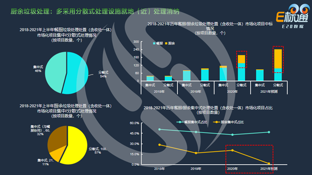 左邊兩圖分別是餐廚和廚余垃圾分散式和集中式處理方式占比情況,2018至2021上半年餐廚垃圾(左上圖)利用分散式方式處理的項目占比為54%,廚余垃圾(左下圖)利用分散式處理的占比更高一些(57%);此外,廚余垃圾的集中式處理方式又分為兩種情況,一種是純廚余垃圾建廠處理的集中式處理模式,另一種是和餐廚垃圾廠協(xié)同處理的集中式處理模式,在總量中占比分別為11%和32%。