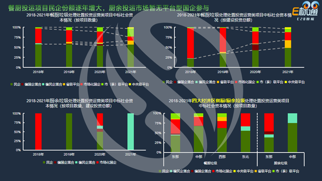 右下圖為近三年四大經(jīng)濟(jì)區(qū)餐廚/廚余垃圾處理處置運營類項目中標(biāo)社會資本情況,餐廚垃圾在四大經(jīng)濟(jì)區(qū)均得到釋放,民企在中部、西部以及東北地區(qū)中標(biāo)的項目過半;廚余垃圾處理處置投運項目僅在東部和中部地區(qū)得到釋放。