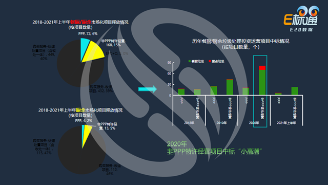 對餐廚/廚余垃圾PPP和非PPP特許經(jīng)營類市場化項目進(jìn)行分析。右圖是歷年餐廚/廚余垃圾投資運營類項目的中標(biāo)情況,2020年非PPP特許經(jīng)營項目存在中標(biāo)的“小高峰”,E20研究院執(zhí)行院長、湖南大學(xué)兼職教授薛濤曾在“2020(第十四屆)固廢戰(zhàn)略論壇”上做題為《“十四五”固廢行業(yè)規(guī)劃與產(chǎn)業(yè)趨勢前瞻》的主旨演講,其中講到環(huán)衛(wèi)和焚燒等細(xì)分領(lǐng)域同樣迎來非PPP特許經(jīng)營項目的一個中標(biāo)小高峰。但不同服務(wù)模式的項目合規(guī)與否、合理與否,薛院長在演講中做了詳細(xì)的各細(xì)分領(lǐng)域合理合規(guī)的邏輯分析。