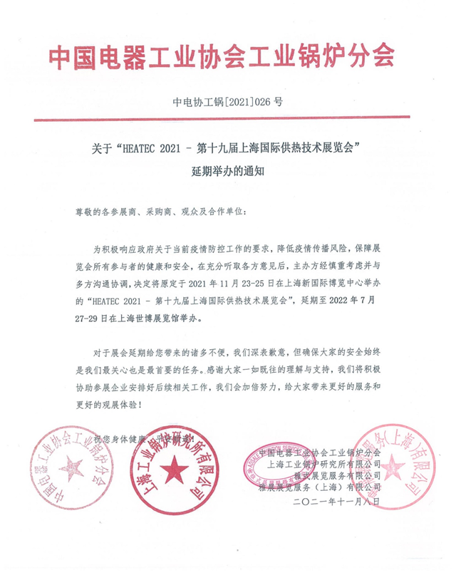 關(guān)于“HEATEC 2021 -第十九屆上海國際供熱技術(shù)展覽會(huì)”延期舉辦的通知