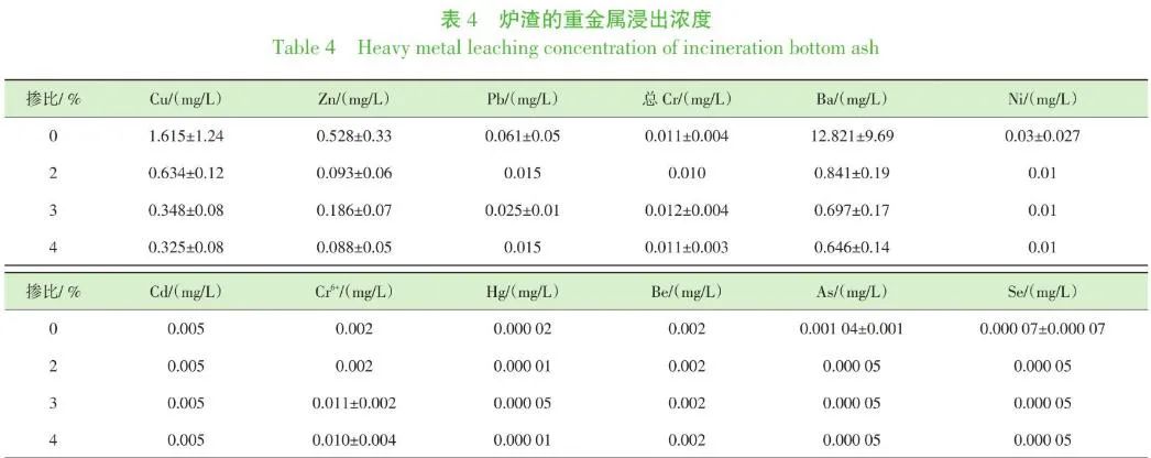 生活垃圾焚燒爐渣中重金屬的含量波動很大,關于醫(yī)療廢物單獨焚燒爐渣中重金屬的零星研究顯示,醫(yī)療廢物焚燒爐渣的重金屬含量在垃圾焚燒底渣的含量范圍之內(nèi)。圖3和表4顯示醫(yī)療廢物摻燒后爐渣的重金屬浸出濃度處于其他焚燒廠僅焚燒生活垃圾獲得的爐渣重金屬浸出濃度范圍內(nèi)。顯著性分析表明:不同比例的醫(yī)療廢物摻燒后主要對于生活垃圾焚燒爐渣中重金屬Cu、Zn、Pb、Ba、Cr6+和As的浸出濃度有影響,對于其他重金屬的浸出并無明顯影響;而且除Cr6+外其他重金屬浸出濃度反而下降。對于Cr6+,摻燒比為2%時與未摻燒無顯著性差異,摻燒比增加到3%和4%時,Cr6+的浸出濃度雖然上升,但是也遠遠低于限值5 mg/L。故摻燒醫(yī)療廢物對生活垃圾焚燒爐渣重金屬浸出特性總體上沒有顯著的影響。