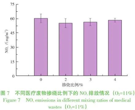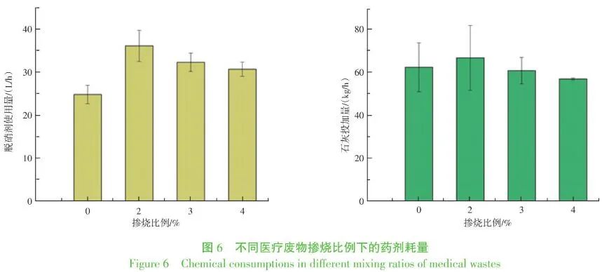 醫(yī)療廢物的Cl典型含量為1.1%~2.1%,而生活垃圾在0.2%~0.8%的水平。但是表2中數(shù)據(jù)顯示醫(yī)療廢物的Cl含量雖然偏高,但是未達到上述水平,這可能與醫(yī)療廢物的來源及取樣有關。由圖5可以看出,日常運行焚燒煙氣中HCl平均含量為3.32 mg/m3,在生活垃圾中摻燒醫(yī)療廢物后煙氣中HCl含量略有降低,這可能是因為進料波動引起的。在2%摻燒比例下煙氣中HCl含量變化不大,僅為3.30 mg/m3,基本與日常運行條件下的含量持平,但是石灰投加量有所增加,如圖6所示。摻燒比例為3%和4%時,HCl濃度反而降低明顯,對應地石灰的消耗量也有所降低,這可能與生活垃圾的組分波動有關,因為摻燒試驗時間長達8 d,生活垃圾組分和醫(yī)療廢物組分均可能出現(xiàn)變化,也說明垃圾組分本身的波動可能掩蓋小比例的醫(yī)療廢物摻燒的影響。